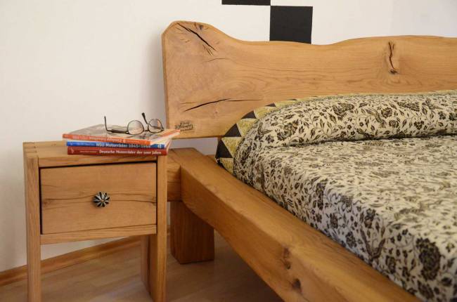 MODELL D-KLON 2 NTAUSFÜHRUNG: MASSIVE EICHEBOHLEN IM STECKSYSTEM , KOPFTEIL NATÜRLICH GEWACHSEN, GESCHLIFFEN UND GEÖLT, MIT INTEGRIERTEM NACHTTISCH LATTENROST AUS UNBEHANDELTEM FICHTENHOLZ